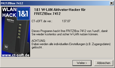 Die gezielte Deaktivierung von WiFi-Funktionalitäten durch 1&1 ist eine Frechheit und schierer Wucher. Ich helfe Ihnen und aktiviere wieder den WLAN-Adapter in Ihrer FRITZ!Box 7412. Einfach, problemlos und sogar aus der Ferne gegen eine kleine Aufwandsendschädigung / Spende von nur einmalig 15,-.