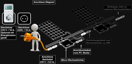 Zu guter Letzt ist es natürlich ungemein interessant, wieviel Leistung in Watt oder auf ein Jahr gesehen in KW/h unsere PV-Anlage eigentlich liefert. Wechselrichter für größere Anlagen oder teils auch kleinere aktiv gekühlte bieten diese Möglichkeiten auf (großen) bunt beleuchteten Displays. Kleine Inverter wie der EVT 500 oder S240W-72 allerdings nicht. (Je größer und bunter ein Display, desto mehr Strom verbraucht es selbst.) Es gibt aber einfache Stromzähler für die Steckdose, die man z.B. zwischen jedes Haushaltsgerät und Dose stecken kann, um den genauen Verbrauch zu ermitteln. Die meisten solcher Geräte zeigen die momentane Leistung, rechnen diese in KW/h um und können, nachdem man seinen individuellen Strompreis eingegeben hat auch direkt den Verbrauch in Euro errechnen und anzeigen. Zusätzlich zeigen die Geräte die aktuelle Spannung und die Netzfrequenz an. Also fast mehr, als uns in der Praxis interessiert. Und umgekehrt funktionieren die Geräte genauso. Wir können uns anzeigen lassen, wieviel unsere PV-Anlage in Watt und KW/h leistet und wieviel Geld wir durch sie gespart haben. Es gibt sogar Zähler für die Steckdose, die wir per W-LAN mit unserer FritzBox verbinden und auf die wir über das Internet mit unseren Smartphones zugreifen könnten. Die daraus resultierenden Möglichkeiten sind nur durch die eigene Fantasie begrenzt. Selbst unsere Do-It-Yourself Photovoltaik-Anlage könnte also auch problemlos ein Bestandteil unseres Smart-Homes werden.