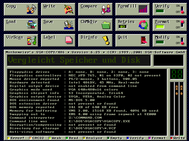 Das, was für die damalige Amiga-Fraktion X-Copy war, war für jeden am PC VGA-Copy von Herrn Mönkemeier. Es war geradezu wie dafür gemacht, "Sicherheitskopien" von kopiergeschützen Disketten anzufertigen. Das tool benötigte zwingend eine VGA-Grafikkarte. Widererwarten wurde die Grafikkarte aber nicht nur benötigt, um das hübsche Foto von Thomas in 8-Bit Farbtiefe darzustellen, sondern weil das tool zum Kopieren den Speicherbereich der Grafikkarte und nicht des RAM adressierte. Zusätzlich bestach das Programm durch echte Sprachausgabe (.VOC) in Form von "reading", "writing" und einer furchtbar dreckigen Lache uvm. wenn man eine Soundkarte besaß.