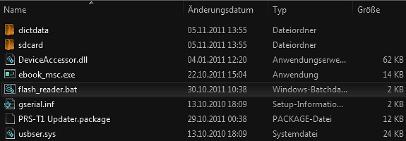 Den Inhalt dieser ZIP-Datei entpackt man in ein eigenes Verzeichnis. Hat man das gemacht, schließt man den PRS-T1 an und aktiviert den Datenübertragungsmodus. Die Laufwerksnamen des Readers dürfen nicht geändert werden und müssen „READER“ und „SETTINGS“ lauten, andernfalls funktioniert der flash-Vorgang nicht.