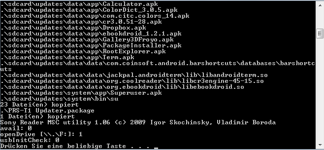 Nach kurzer Wartezeit ist es geschafft, der PRS-T1 ist gerootet. Zu diesem Zeitpunkt (siehe unteres Bild) kann man das Fenster mit einem Druck auf eine beliebige Taste schließen und den Reader abstecken. Ich musste trotz anderslautender Anzeige am Display einen manuellen Neustart durchführen. Das funktioniert wie gewohnt über den Reset / Power-Knopf.
