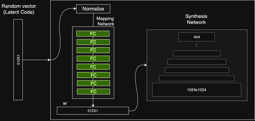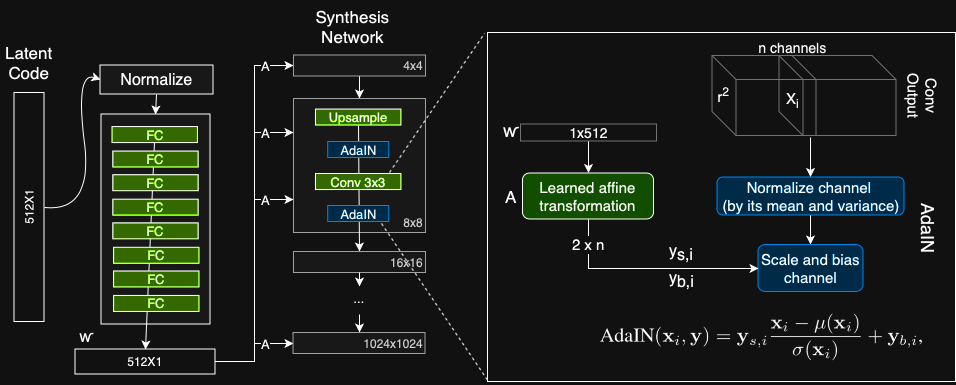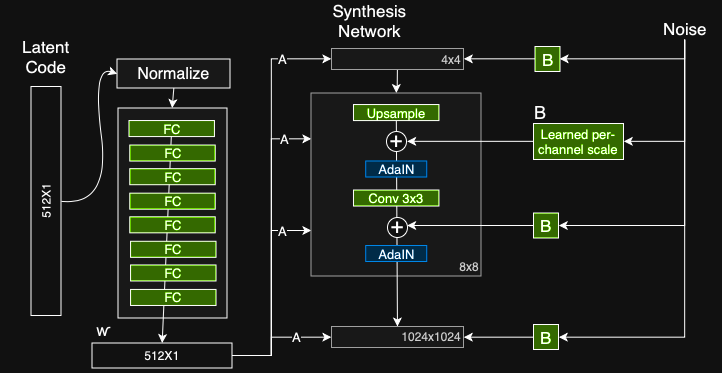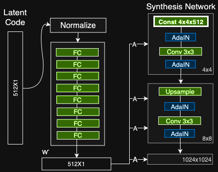 Das Ziel des Mapping-Netzwerks besteht darin, den Eingabevektor in einen Zwischenvektor zu codieren, dessen verschiedene Elemente verschiedene visuelle Merkmale steuern. Dies ist kein trivialer Vorgang, da die Möglichkeit zur Steuerung visueller Merkmale mit dem Eingabevektor begrenzt ist, da diese der Wahrscheinlichkeitsdichte der Trainingsdaten folgen müssen. Wenn beispielsweise Bilder von Personen mit schwarzen Haaren häufiger im Dataset vorkommen, werden diesem Feature mehr Eingabewerte zugeordnet. Infolgedessen ist das Modell nicht in der Lage, Teile der Eingabe (Elemente im Vektor) auf Features abzubilden, ein Phänomen, das als Feature-Verschränkung bezeichnet wird. Durch die Verwendung eines anderen neuronalen Netzwerks kann das Modell jedoch einen Vektor generieren, der der Verteilung der Trainingsdaten nicht folgen muss, und die Korrelation zwischen Merkmalen verringern. Das Mapping-Netzwerk besteht aus 8 vollständig verbundenen Layern, und sein Ausgang w hat die gleiche Größe wie der Eingang (512 × 1).